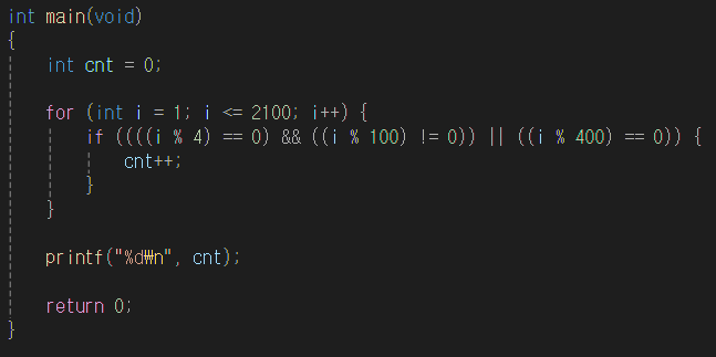 1년부터 2100년까지 윤년이 총 몇 번 있었는지 '횟수'를 구하는 코드를 짜봅시다!